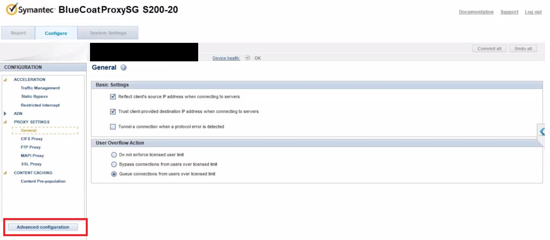 To only temporarily browse the Advanced UI instead, click on 'Advanced Configuration'. A new browser tab opens up with the Proxy Advanced UI