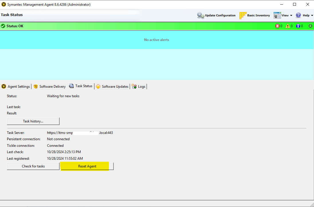When you double-click on the Altiris Agent (Symantec Management Agent) go to the Tasks tab, and press the "Reset Agent" button, what does this do?