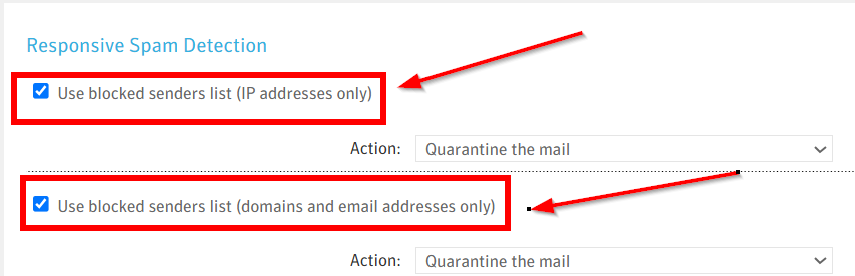 Under Responsive Spam Detection, select the appropriate checkbox to enable the blocked senders list depending on which type of senders in your lists are allowed to bypass the scan: only IP addresses, only domain names and email addresses, or all types of sender (select both boxes).