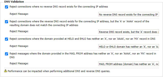 You can customize the reject message that will appear in the NDR (dependent on the senders' MTA). We recommend that you configure each option with a unique reject message that identifies the type of DNS failure triggered to facilitate troubleshooting.