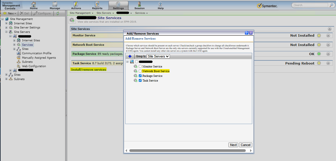 In the SMP Console under Under Settings > Notification Server > Site Server Settings > Site Servers > <Site Server> > Install/removes services you'll see: