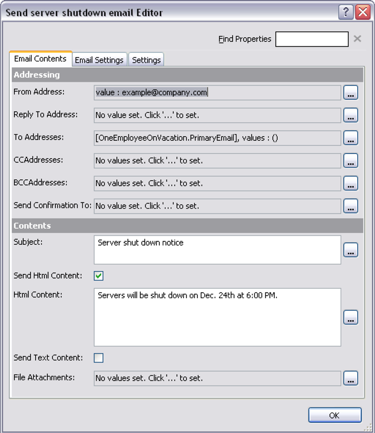 Scenario: A company plans to shut down some of its servers during the holidays. Most employees are out of the office, but the few who are working need to know when the servers will be unavailable. A workflow process notifies only working employees of the server shutdown.