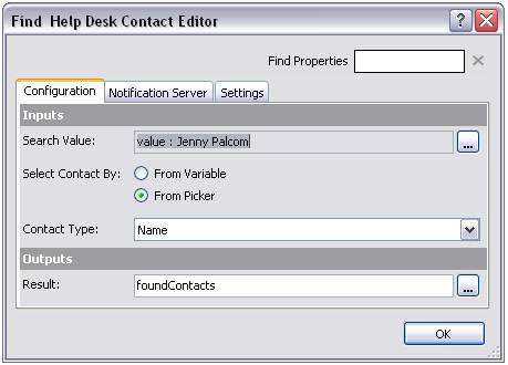 The following screen shot shows the editor for the Find Help Desk contact component: