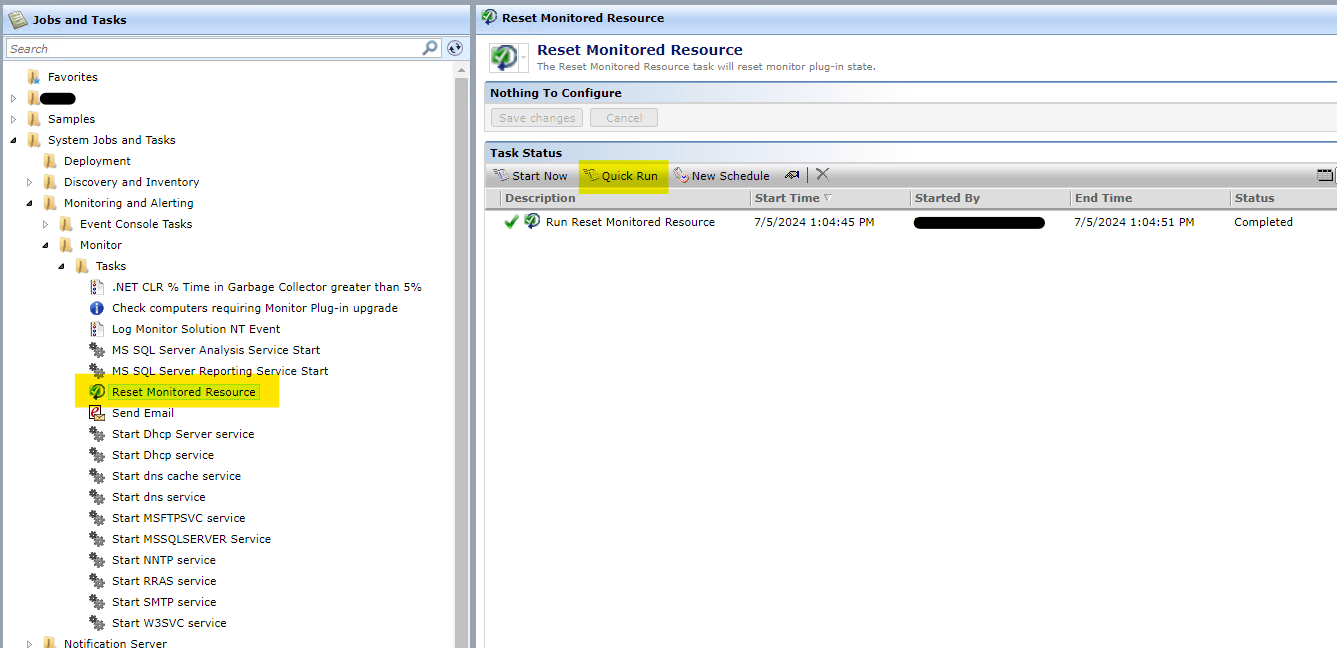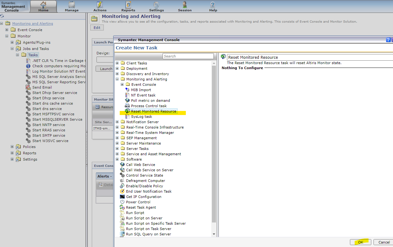 - Under the Monitoring and Alerting folder, select Reset Monitored Resource, then OK