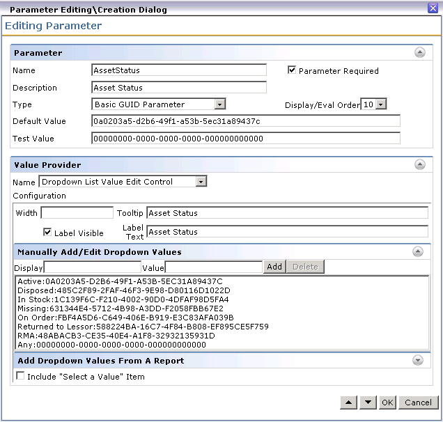 - In the Default Value field, enter the desired starting GUID (optional). For example, "0A0203A5-D2B6-49F1-A53B-5EC31A89437C" for the Active status. Then, when the report is first opened, all Active assets are displayed by default until the user changes the Status drop-down list value and clicks on the Refresh button.