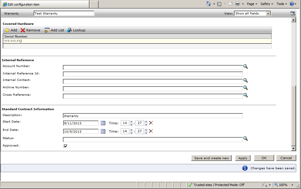 Create a Warranty: Click Home>Service and Asset Management>Contracts>Contract Types>Warranty. Right-click, and Create New Warranty. For a Warranty to work correctly, the minimum fields are required to be filled out, Standard Contract Information, and Covered Hardware.