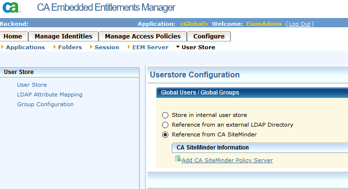 To configure CA EEM server to point to CA SiteMinder Policy Server objects, access the CA EEM Administrator UI.