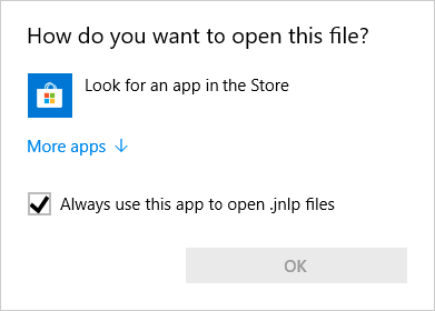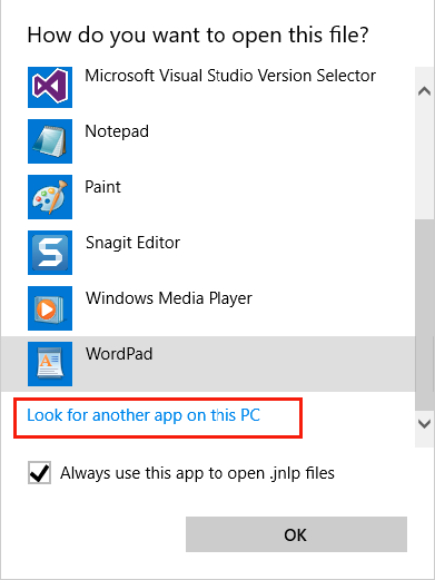 Click On: Look for another app on this PC Note: Check the 'Always use this app to open .jnlp files' so you will not need to perform this step next time