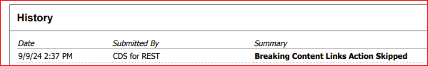Incident History shows: Breaking Content Links Action Skipped