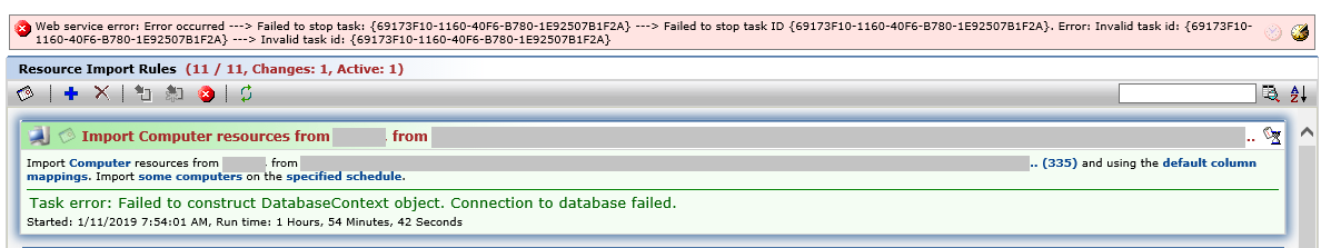 After a network issue where the connection to the database got disconnected, an AD Import Rule failed to stop, giving the following error: