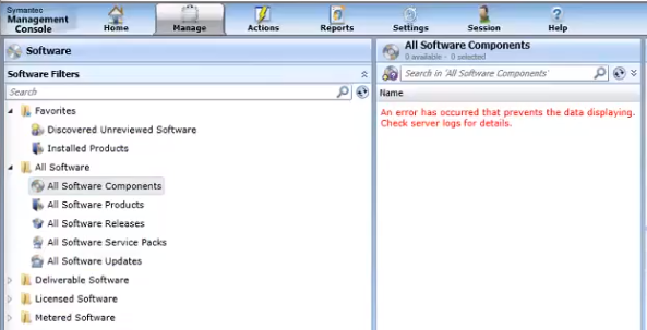 Browsing the Manage > Software page and you see the following error after clicking on a software filter: