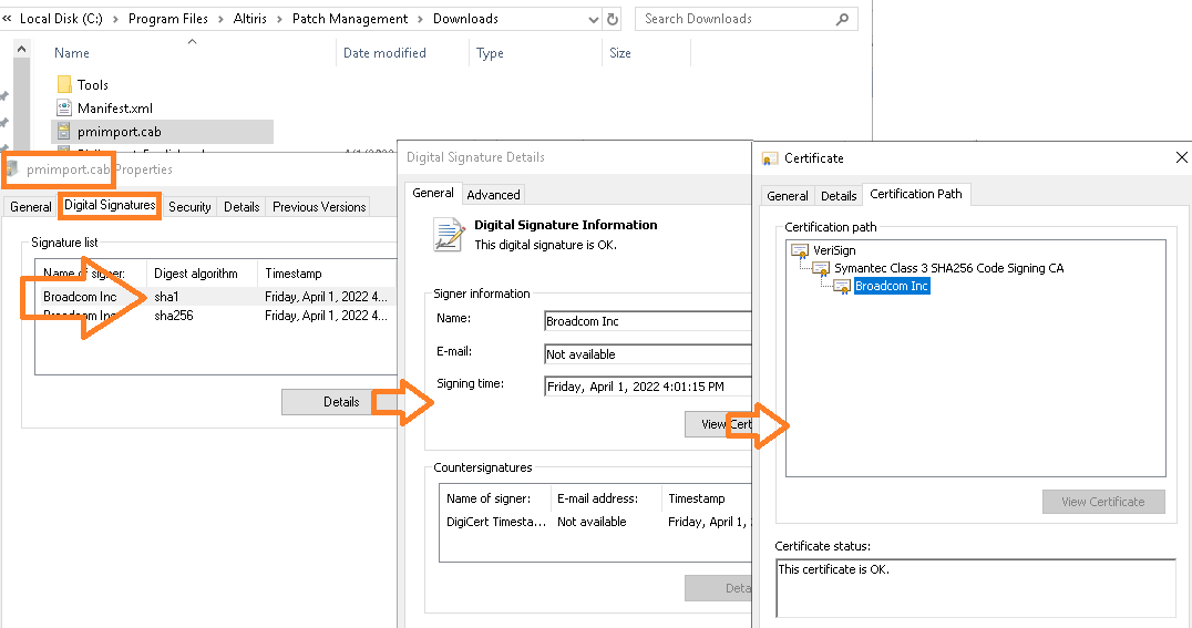 Scenario 2) Error Message: "Downloaded file has an incorrect or missing digital signature, previous version of the file will not be replaced. An error occured while verifying trust for object 'D:\Program Files\Altiris\Patch Management\Downloads\Tools\pmimport.cab.TMP' (TimeStamp)