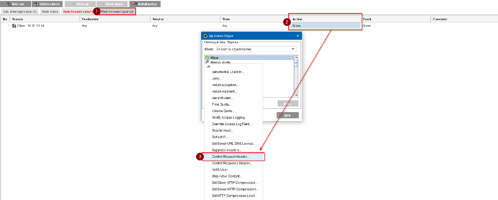 Following is an example on how to append an XFF header to include the original client IP. In the example below, the proxy will only append the header if that the original source IP matches 10.10.10.10. All other traffic would not append the XFF header. The main takeaway from the article is the "Action Object" in which we add the header and append the $(client.address) substitution variable.