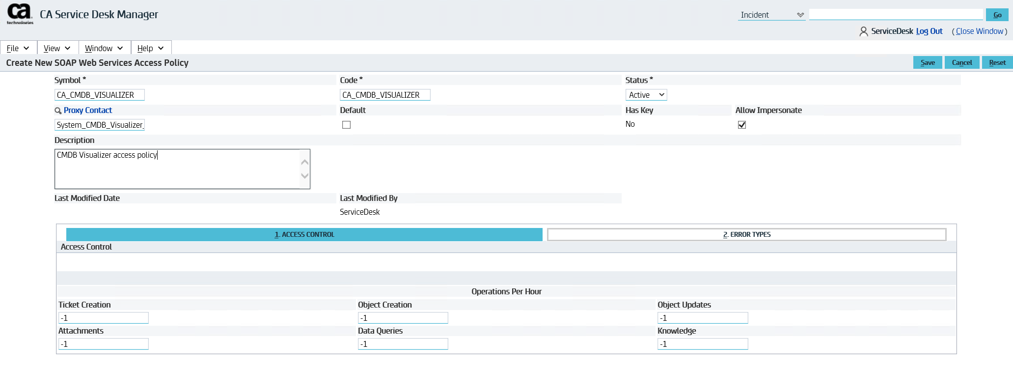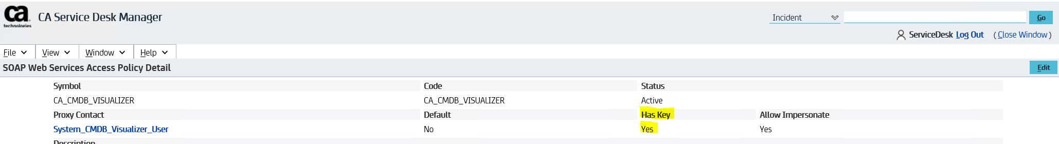 After the SDM service restart, re-check the CA_CMDB_VISUALIZER policy via the Administration tab -> SOAP Web Services Policy -> Policies. You should see that the 'Has Key' boxed is now set to YES