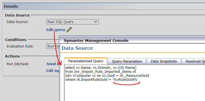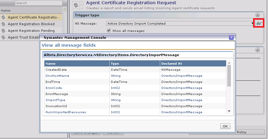 Sometimes, the messages are coming from the items that should be checked for some internals first, and then executed if applicable. In the following sample case, RuleGuid property of the NS Message is an Item (AD Import Rule) with property Server.