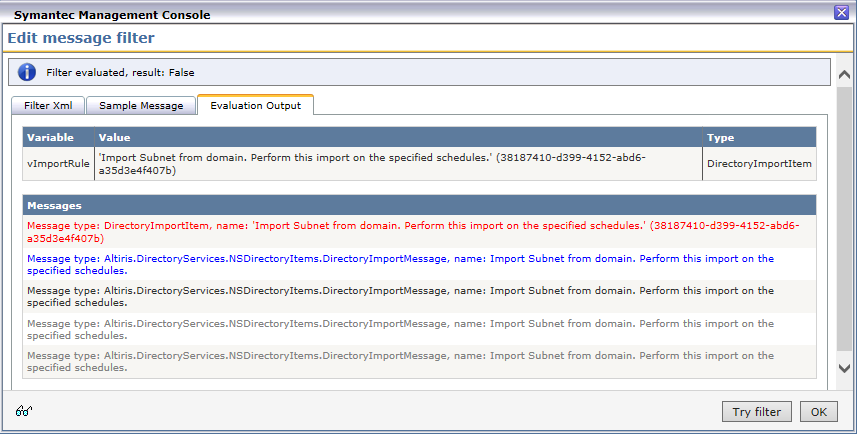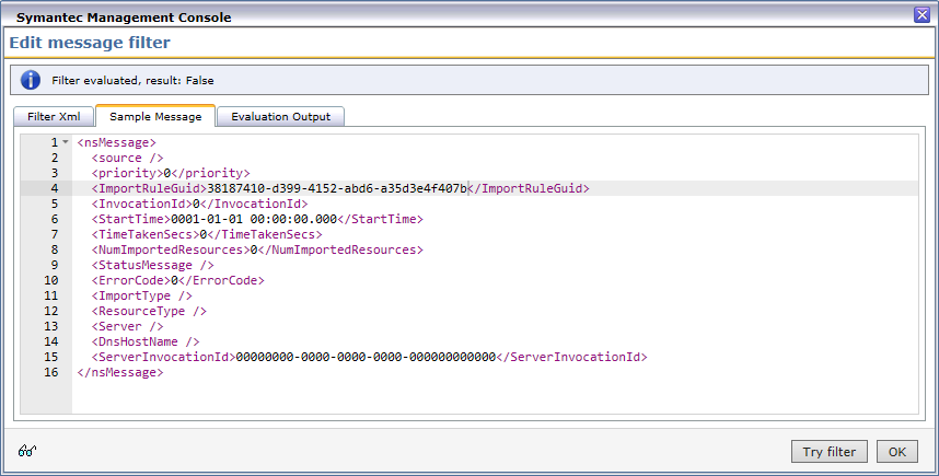 The examples below provide you with the most useful filtering XML examples. The examples are based on the Active Directory Import Completed NS Message.