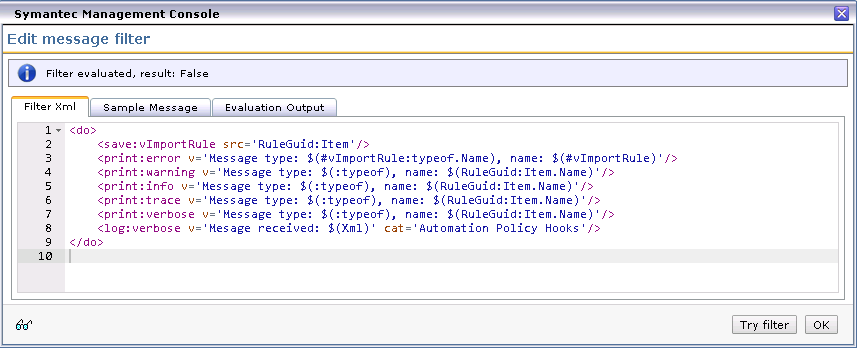 This filter will log 2 messages in SMP Log and then stop Automation Policy to proceed: