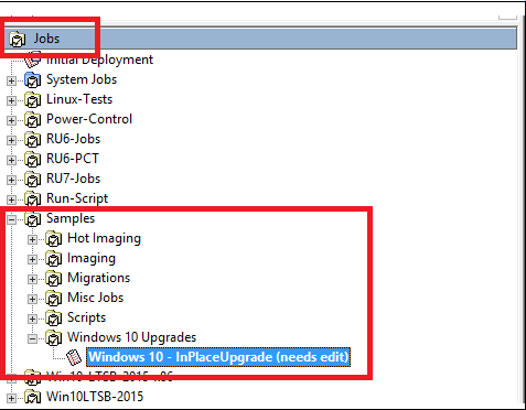 The sample job is added under Jobs > Samples> Windows 10 Upgrades > Windows 10 – InPlaceUpgrade(needs edit) path as shown here: