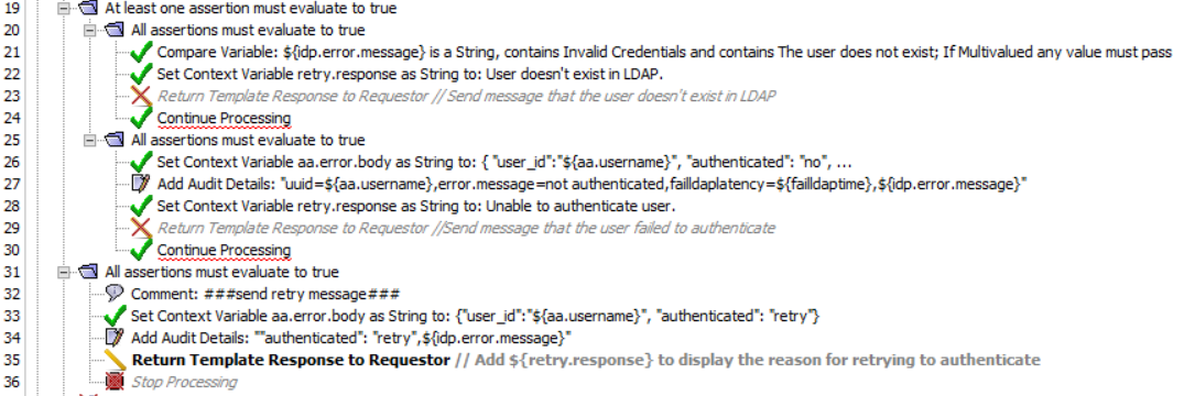 If you do this, you can't display the messages you want to see in Step #2 (because you are continuing to process the policy). If you want to see the messages but you still want to retry, set a message to a context variable called retry.repsonse.