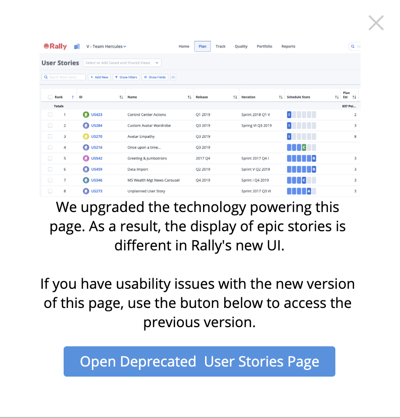 Next click the "Open Deprecated User Stories Page" button