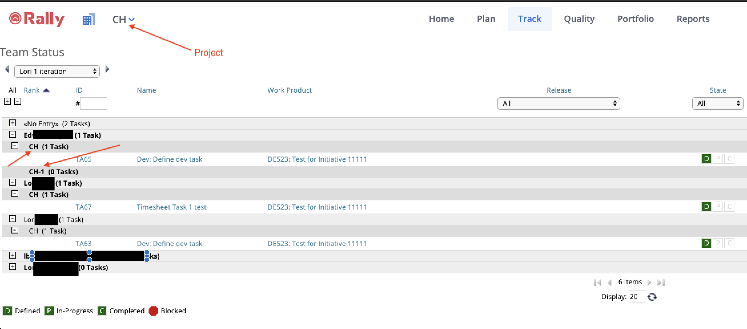Rally: Team Status page is displaying projects for each user