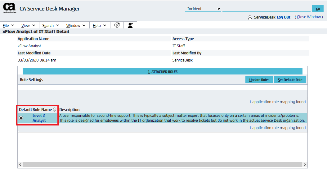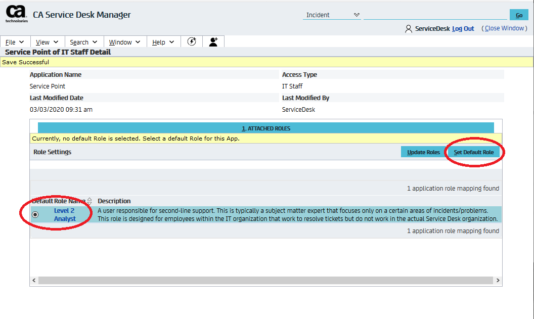 Click OK to save the Role selection. You may also opt to make the "Level 2 Analyst" Role the default role for Service Point Application, which we will do here.