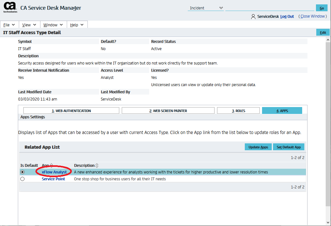 Optionally, you can also choose the "Service Point" app, and assign the same "Level 2 Analyst" Role, which we have modified to disallow creation of Call Requests. To do this, on the "IT Staff" Access Type Detail window, choose the "Apps" tab. Select the "Service Point" app.