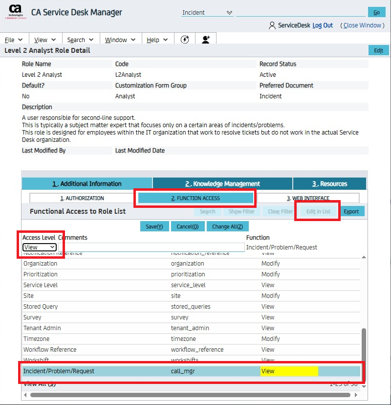 Under the "Level 2 Analyst" Role Detail, entry "Function Access", set the function access for "Incident/Problem/Request" from "Modify" to "View". Use "Edit In List" to change the given entry. Save the change.