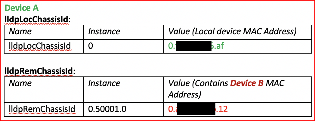 This example shows the lldpLocChassisId and lldpRemChassisId value of the MAC Address type. This value can be either Network address or chassisComponent etc., which is decided by the lldpLocChassisIdSubtype. Let's consider device A and device B: