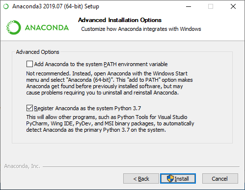 - Under "Advanced Installation Options", do not make changes to the options given. Leave "Add Anaconda to the system PATH environment variable" unchecked and "Register Anaconda as the system Python 3.7" checked.