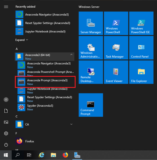 - From the Windows Start Menu, access "Anaconda3 (64 bit)" and click on the "Anaconda Prompt" menu entry.