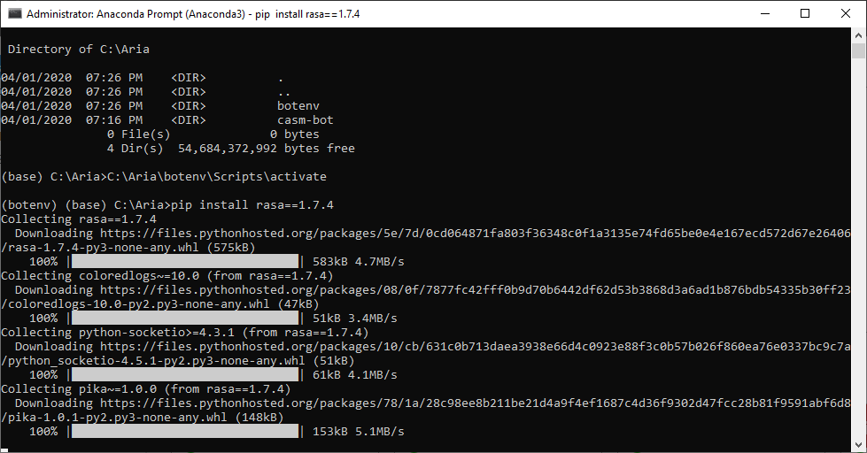 Important: We are creating the "botenv" environment under "C:\Aria" to keep the overall environment organised. The essential components of the environment are all being contained under "C:\Aria".