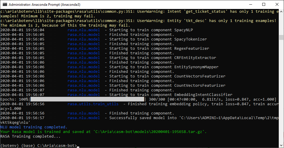 Note: Leave the Anaconda Prompt up in order to monitor the Aria ChatBot functionality. If you need to restart Aria ChatBot or make any changes, you must re-train Rasa (rasa_train) before running Rasa (rasa_run).