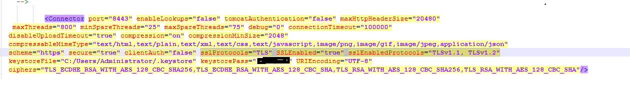 2. Locate the section to configure SSL searching for <Connector port="8443" protocol="HTTP/1.1"