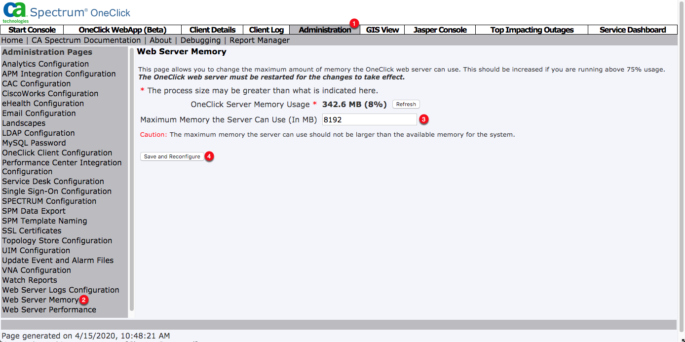 Increase the memory allocated to the OneClick tomcat that the spectrumgtw is integrated with. In this specific case, the OneClick server was set to the default 4096M so we ensured that the machine had enough free memory and increased the memory to 8192M.