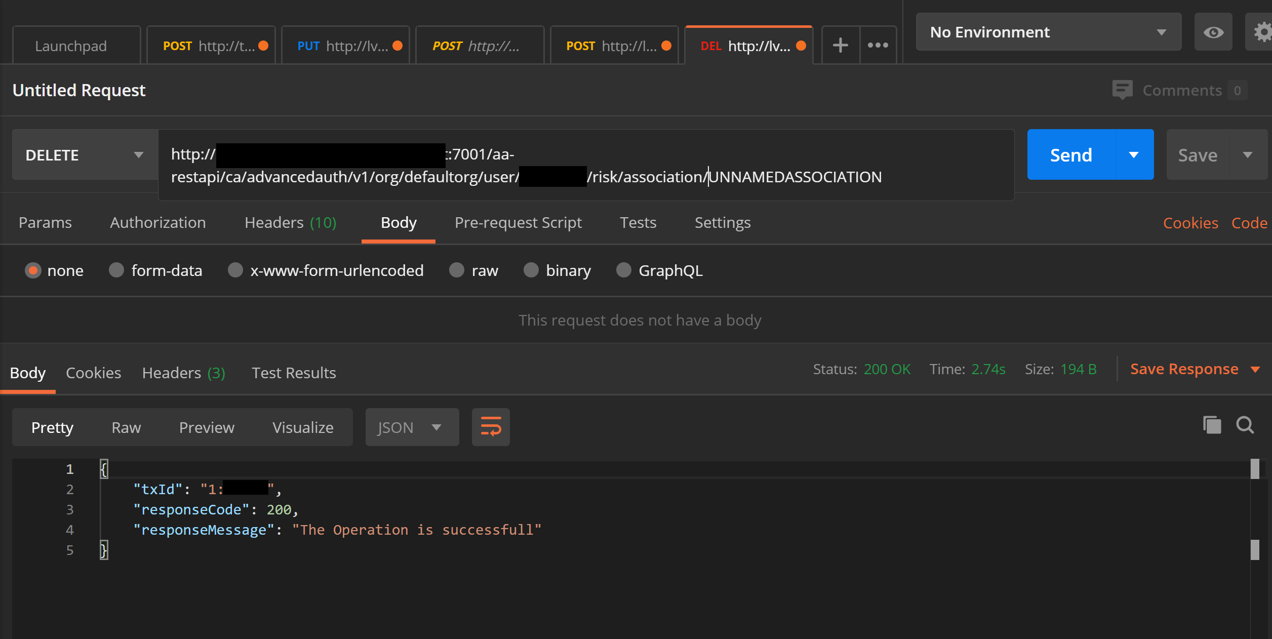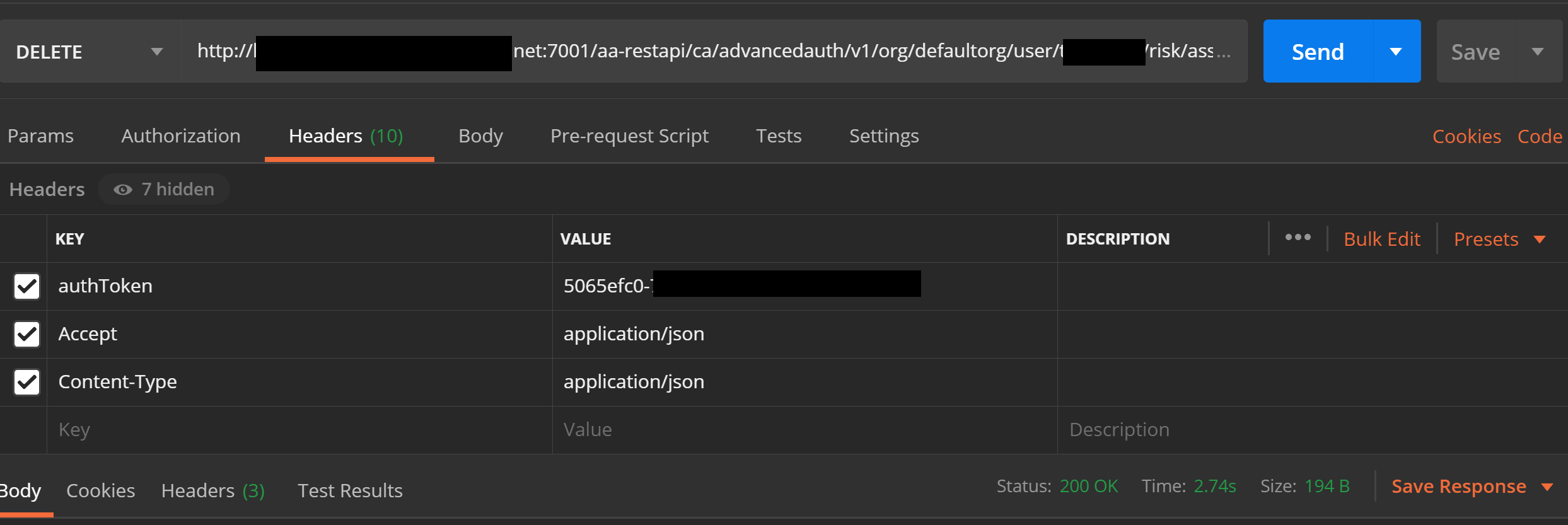 Here is an screen shot which has the steps to delete a user association using the Rest API. The port number in the end point URL should be the application server port where the aa-restapi.war file is deployed. First screen shot has the header values and next screen shot has the actual request.