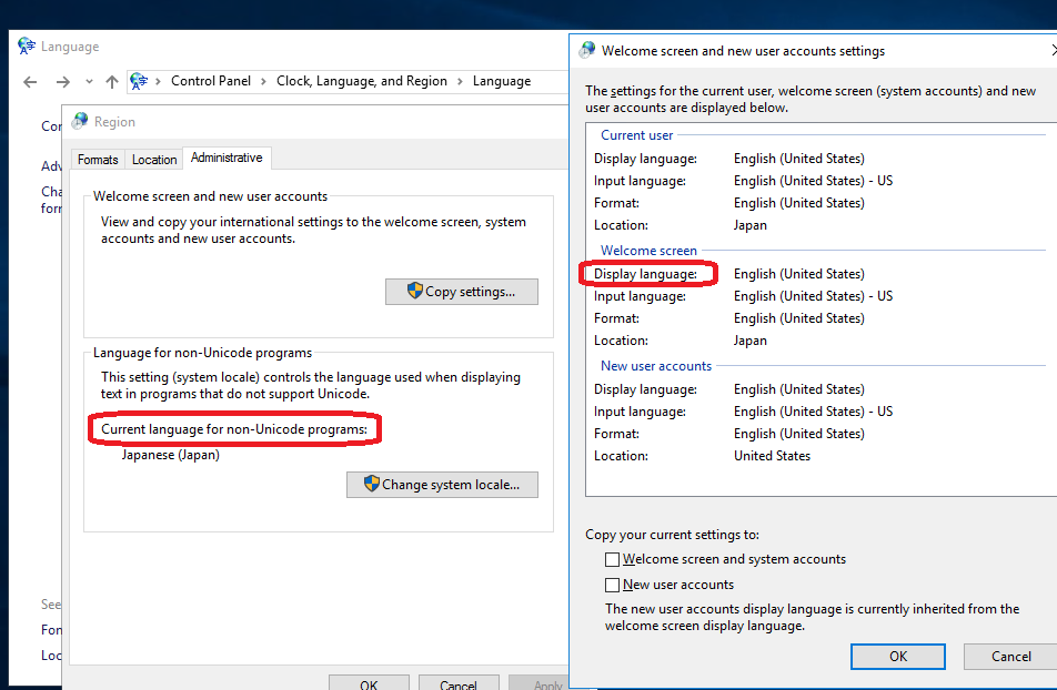 Product limitation. This issue occurs when [Language for non-Unicode programs] and [Display language for Welcome screen] are different.