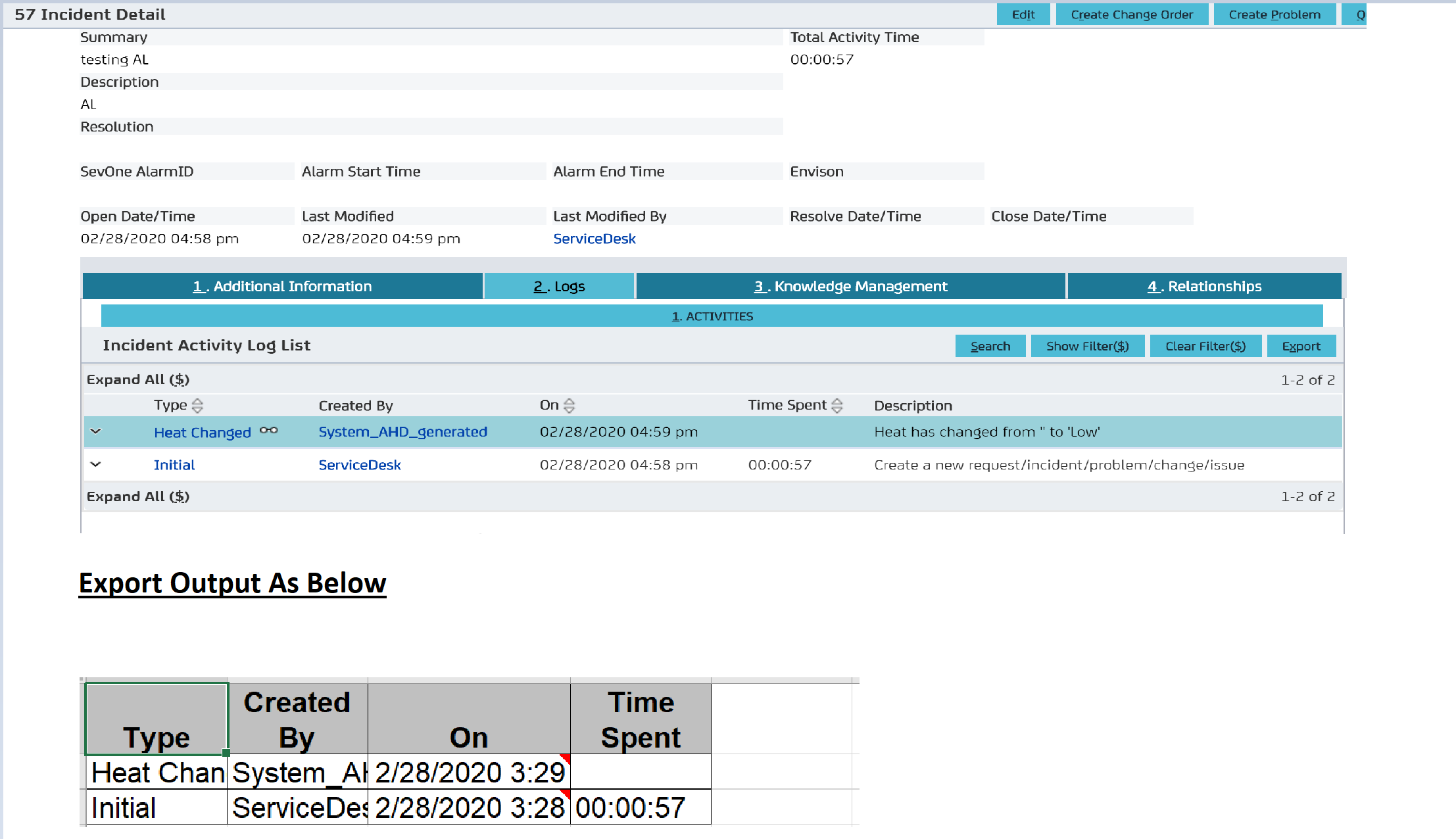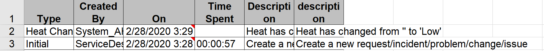 After exporting a Service Desk Manager ticket's activity log, in the exported file there are only four (4) columns (Type, Created By, On and Time Spent).