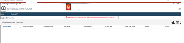 User is having an issue getting to resources she has used before. When trying to access target accounts she gets Error: PAM-UI-1005: Authorization failed. User does not have permission for this action.