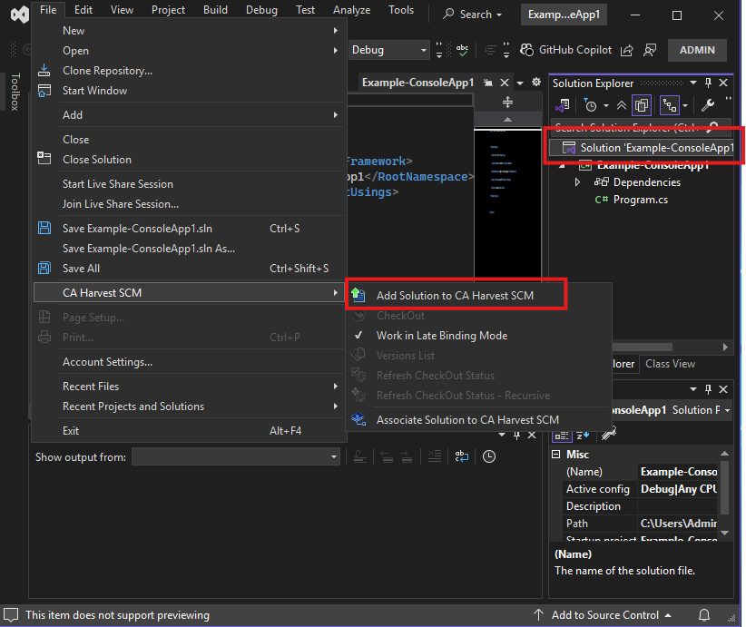 In Visual Studio the "Add Solution to CA Harvest SCM" is disabled (greyed out).