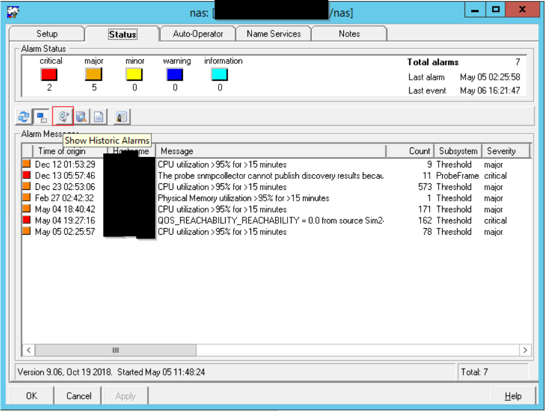 To see these alarms go to the IM console > Primary Hub > nas > configure > Status > click the Show Historical Alarms button (third icon from the left)