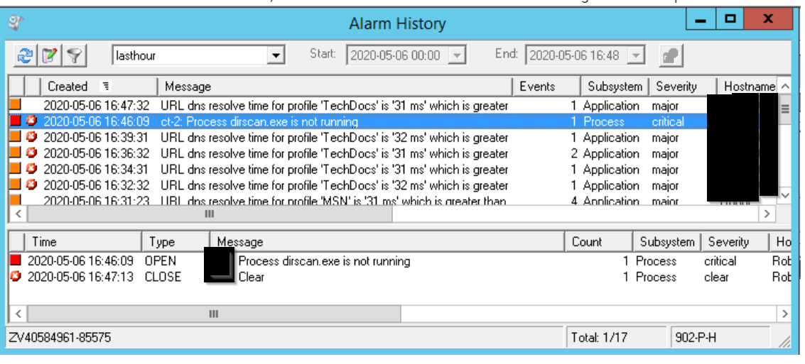 Select and then double click on the alarm, and both the alarm and the alarm clear message will show up in the bottom window.
