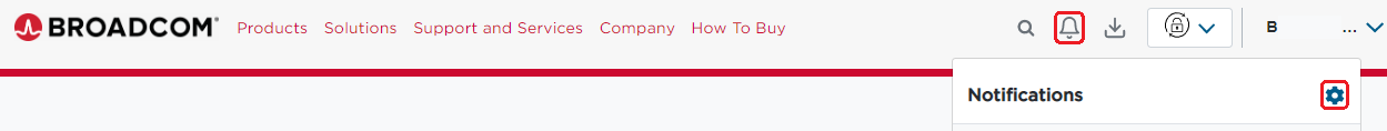 To sign up for proactive notifications, log into support.broadcom.com, click the bell in the upper right of the page, then click the settings icon.