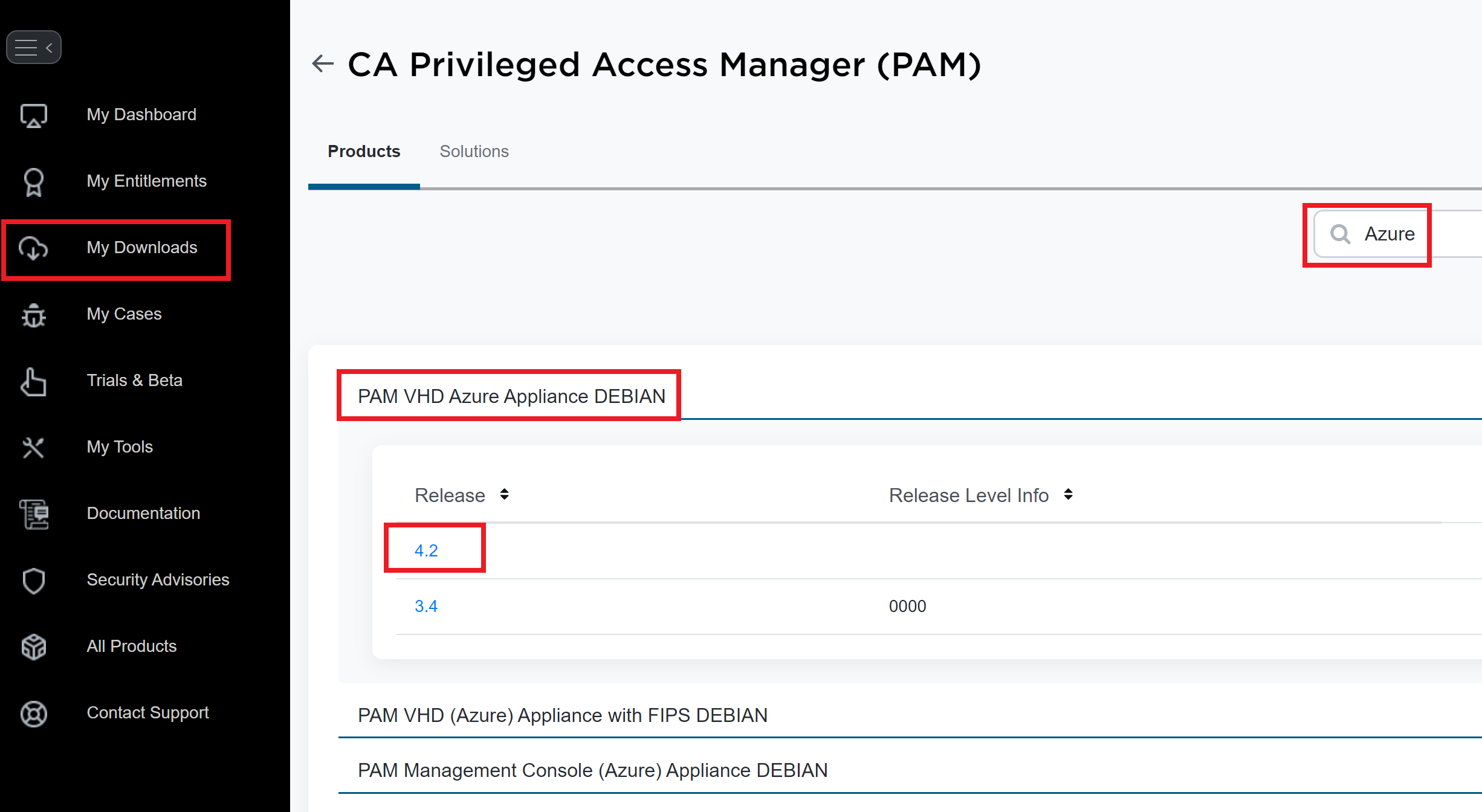5- Key in "Azure" in the search field and expand "PAM VHD Azure Appliance DEBIAN" item and click the release blue link, i.e. 4.2. In the same page,CA PAM for VHD for Azure with FIPS as well is available for download.