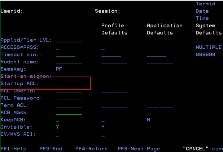 The startup ACL at USER Session Level field, when not specified, needs to be filled in with UNDERSCORE characters ( i.e Startup ACL : ________ )