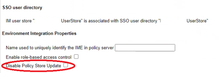 Selecting this option disables the synchronization between the policy store in CA Single Sign-on (formerly SiteMinder) and Identity Manager from both the Directory or the Role Definition XML. This feature only applies to a pairing of CA Single Sign-on and Identity Manager. A message is displayed during the XML file's import that the associated Policy Store will not be updated for this environment.