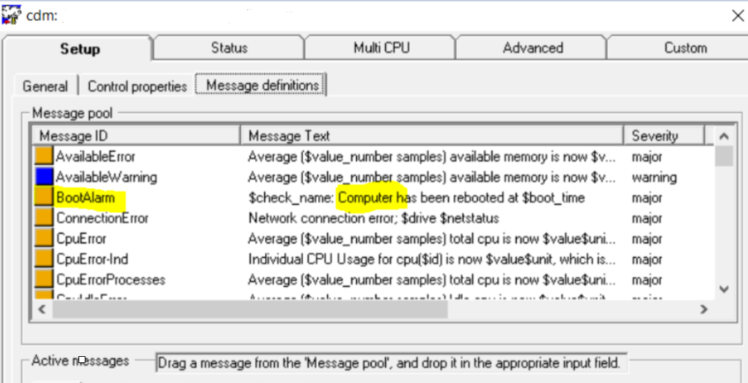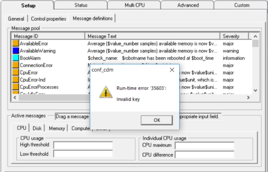 Have MCS installed and configured in our environment. Tried to change the message in the CDM probe for "Computer reboot" either to add the $robotname or change severity and I get a Run-time error of 35603 (attached). How to change if possible?