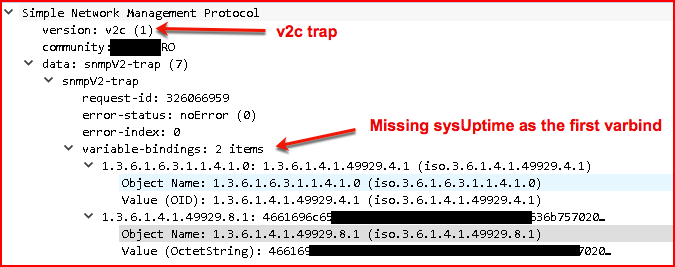 Via a wireshark/tcpdump capture, we can see there is a missing varbind for sysUptime which should be the first varbind.