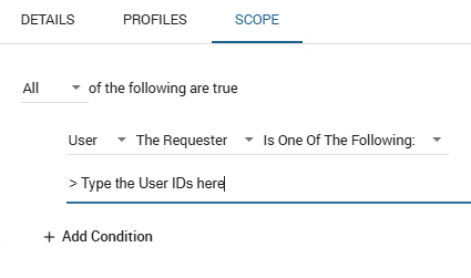 - From Scope tab, add a condition as follow, adding the user Ids