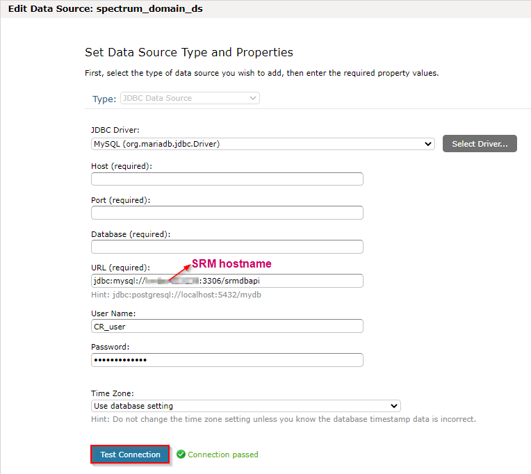 5. Ensure the correct SRM (Spectrum Report Manager) hostname is supplied in the URL field. Also ensure the User Name is CR_user. The password for the CR_user is '0n3cl1Ck' (without quotes). Click on Test Connection button.